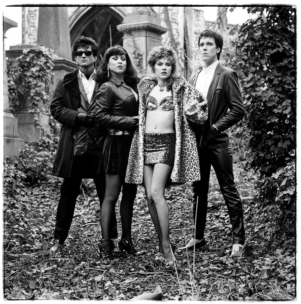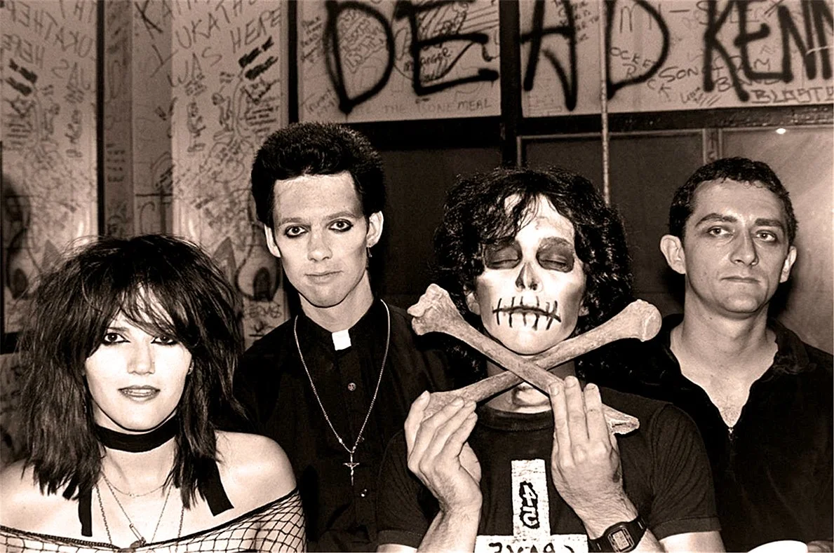 Working among the New York punk scene of CBGBs and Max’s Kansas City, The Cramps separated themselves with a sound that mixed rockabilly and punk – eventually dubbed psychobilly - making their sound unique. They also had offbeat lyrics that mixed sci-fi themes. Their presentation mixed a punk look with a ‘50s camp style, which created a retro link that would inspire future goths. Stage names were adopted, with Purkhiser known as Lux Interior and Wallace as Poison Ivy. Lux Interior’s style with black leather outfits and pale-faced make-up would inspire goths.