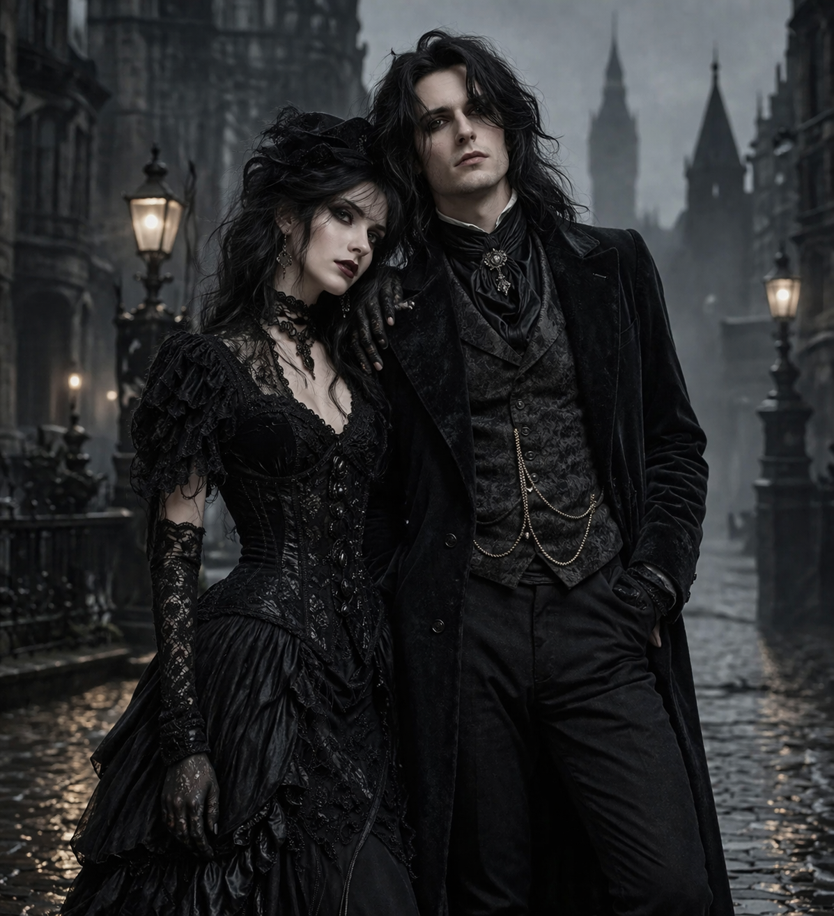 Goth fashions often channel the styles of the Edwardian and Victorian eras, the periods for gothic literature. Musicians don’t often adopt these styles, it’s more popular as fashion, whether related to the music or not.